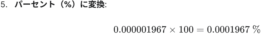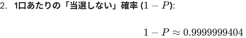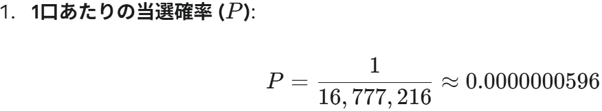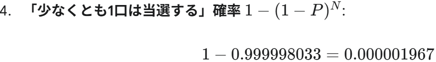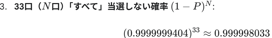 この結果が、当選確率テーブルに「0.0001967 % (約 1/508,400)」といった形式で表示されます。