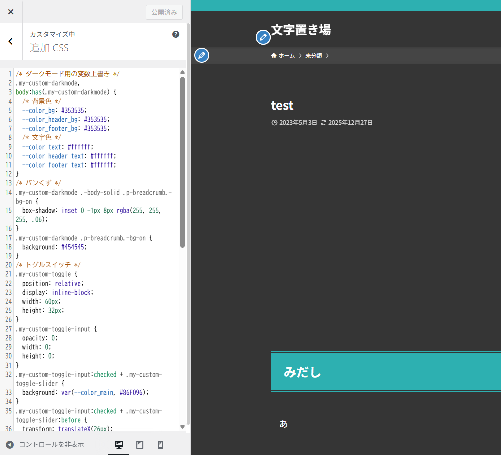 my-custom-darkmode というクラスに対して、背景色や文字色のCSS変数を上書きするスタイルを追記。
