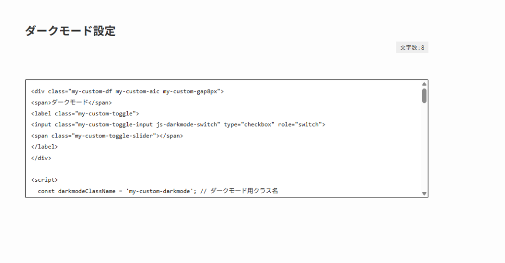 const darkmodeClassName = 'my-custom-darkmode'; // ダークモード用クラス名