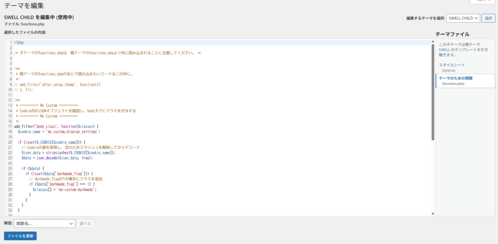 外観>テーマファイルエディタ>SWELL_SHILD>functions.php にて、下記のように追記。